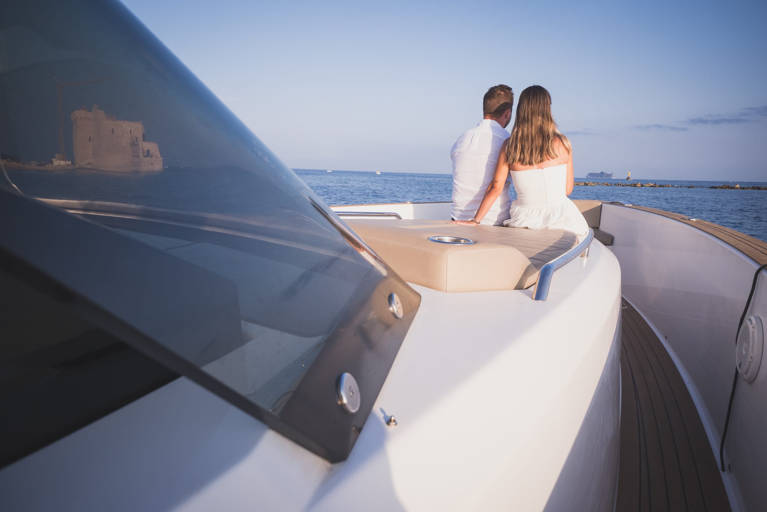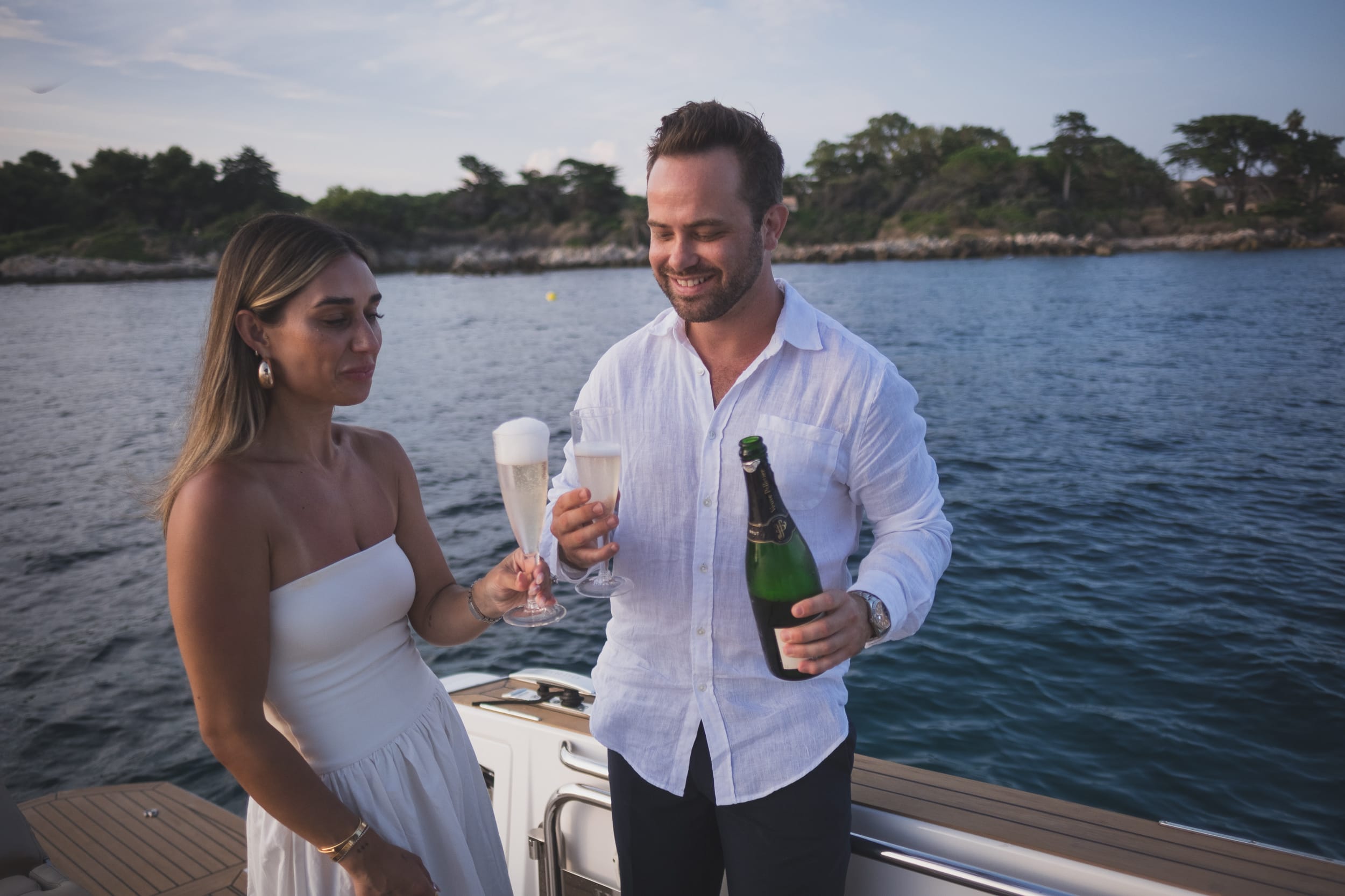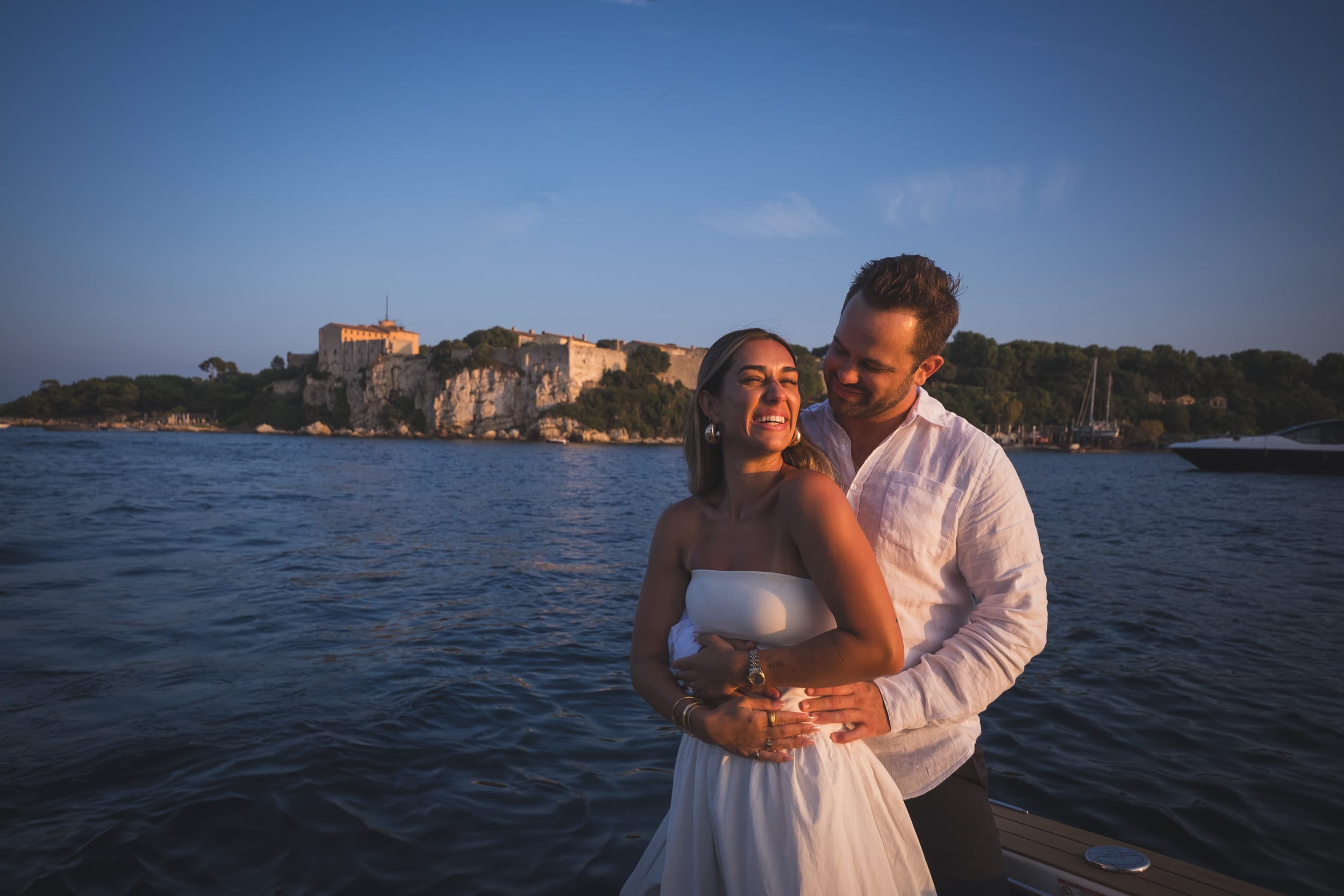 After the proposal, champagne flowed and laughter filled the deck. They sailed slowly around the islands, passing the soft glow of La Guérite and the shadowed outline of the ancient fort, both silent witnesses to their joy. The air was still, and the world felt theirs alone. Before returning to shore, we paused for a few tender photographs in front of the iconic Hotel Martinez, its soft art deco lights reflecting on the water. The joy on their faces spoke for itself—pure, radiant, and real. What began as a setback transformed into a night of effortless romance, a Cannes yacht proposal that perfectly captured the spirit of the French Riviera: timeless, elegant, and deeply intimate.