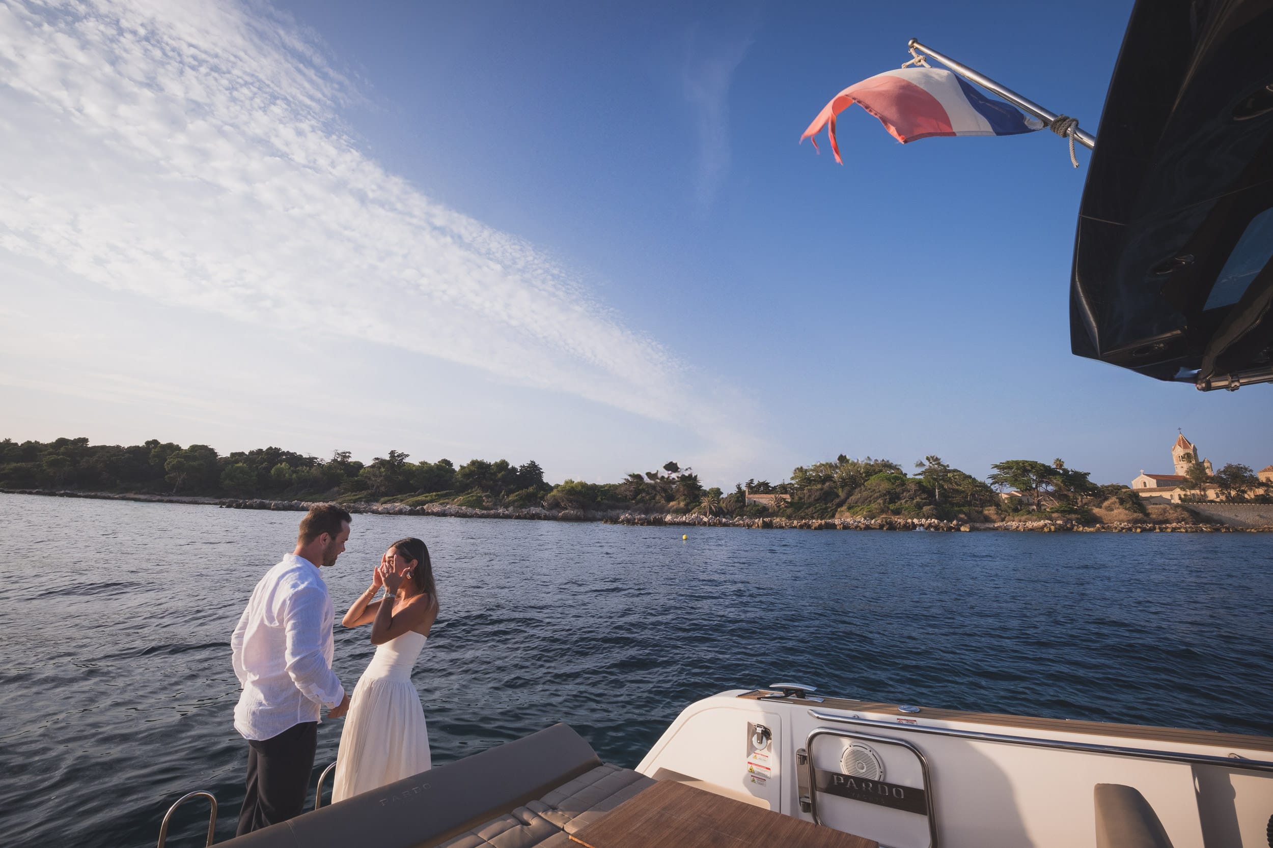 That evening, the Riviera unfolded in all its golden beauty. From the old port of Cannes, they stepped aboard a sleek Pardo yacht, greeted by the soft scent of the sea and a sky painted in warm tones of coral and rose. The gentle hum of the engine faded into the rhythm of the waves as they sailed toward the Lérins Islands, a cluster of serene jewels floating just off the coast. As the sun began to sink beyond the horizon, the light wrapped around them like silk—gold glinting off the water, the air soft with salt and promise. It was there, amidst the calm, that Austin knelt and asked the question that would forever change their story. Her answer, whispered with emotion, seemed to linger in the sea breeze.