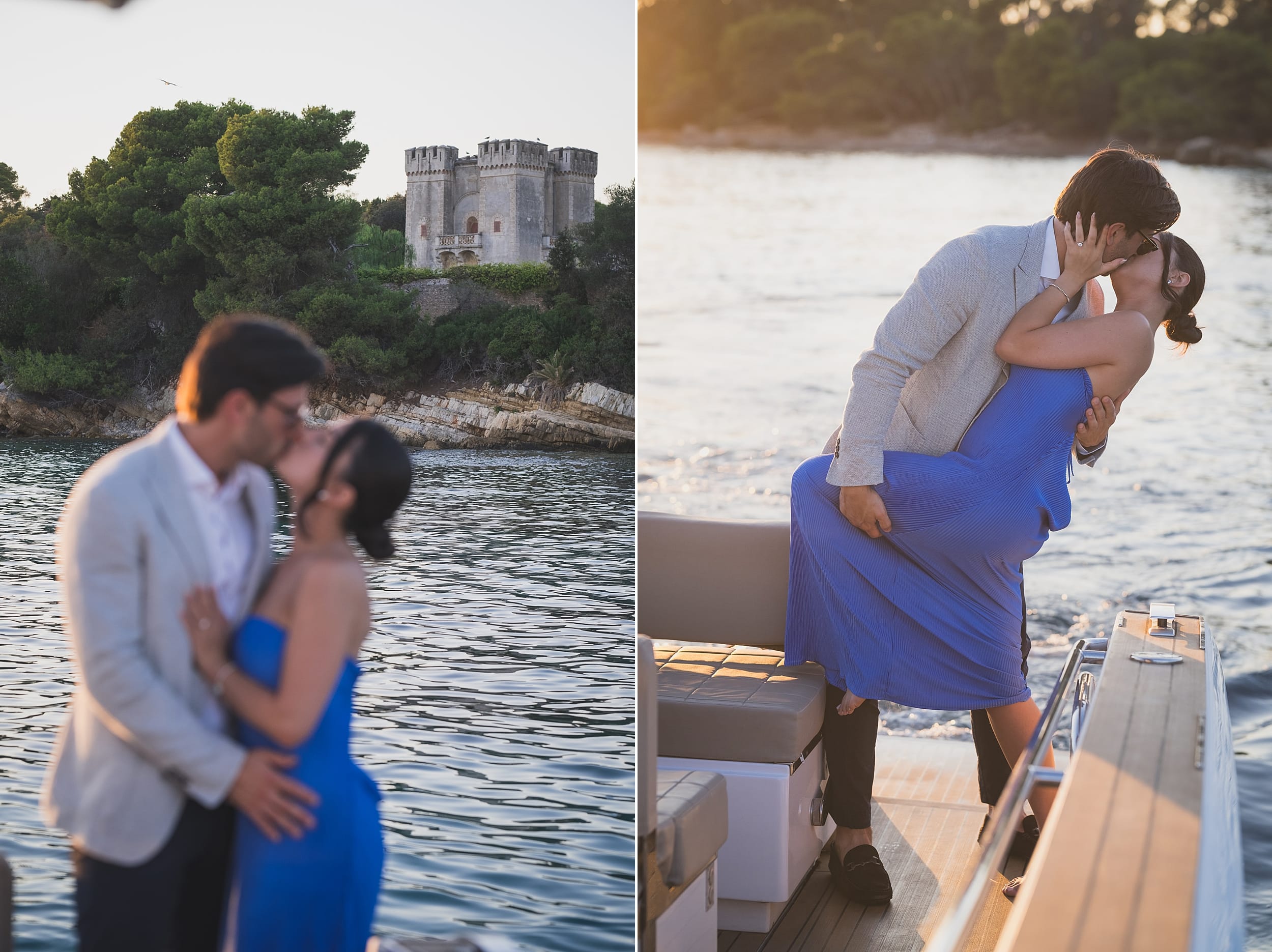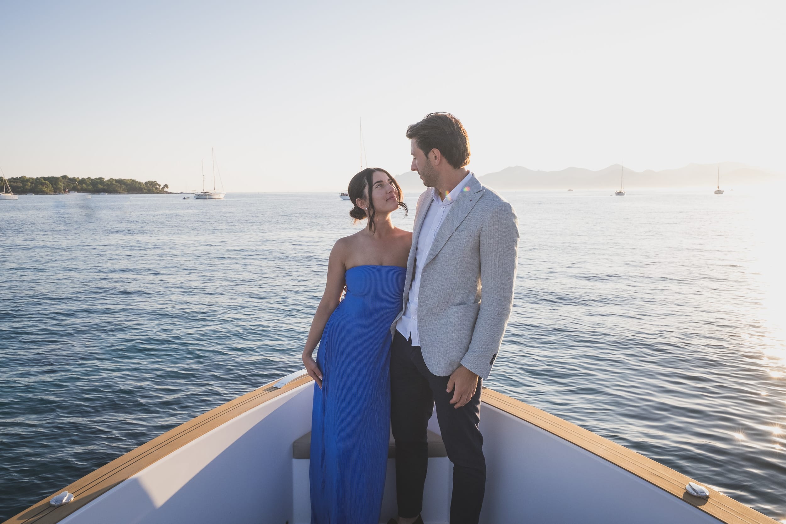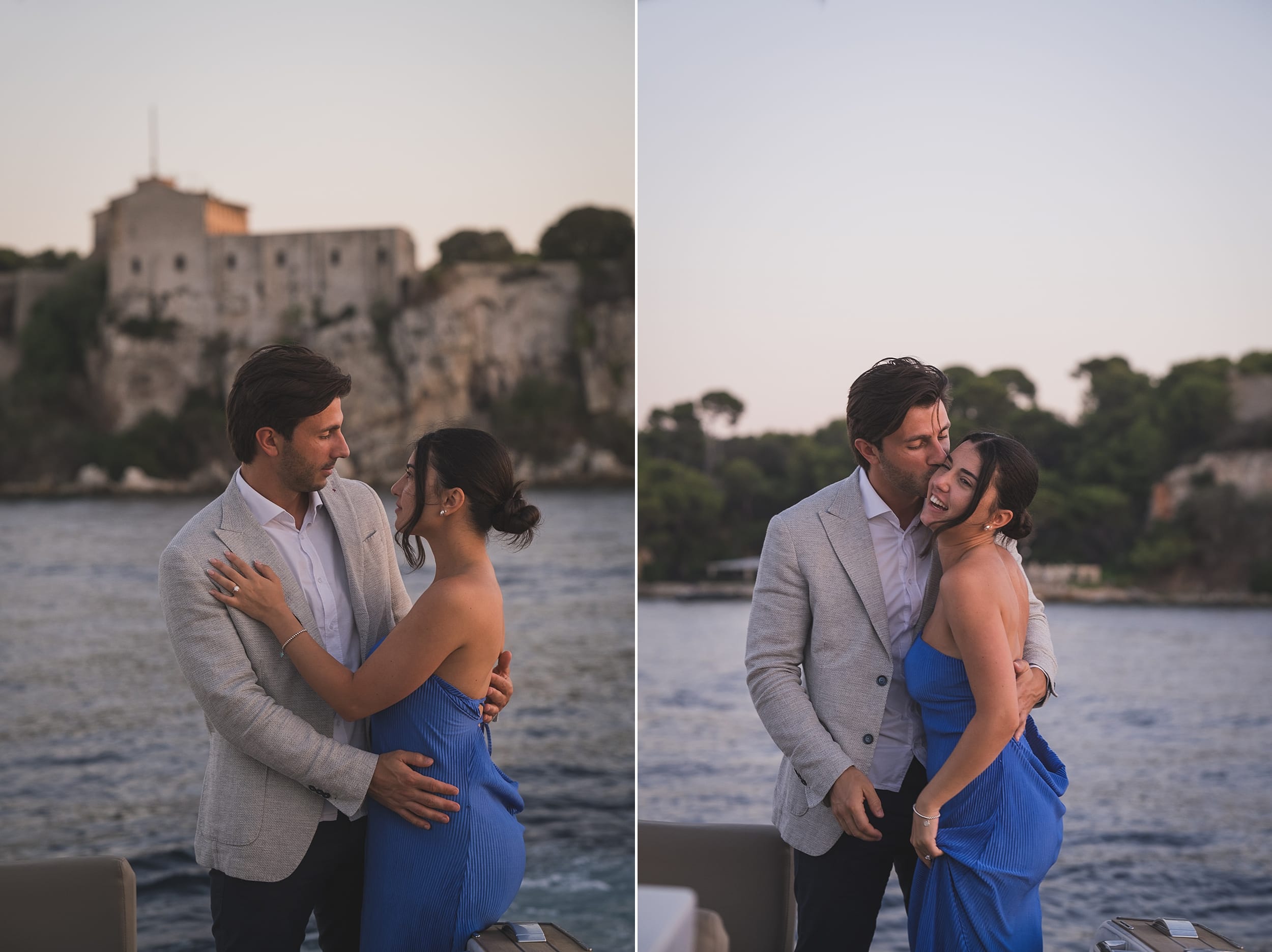 We ended the session near Saint-Marguerite Island, with the calm waters and the Cannes skyline behind them. The reflection of the city lights on the water created a perfect cinematic backdrop for the final photographs.