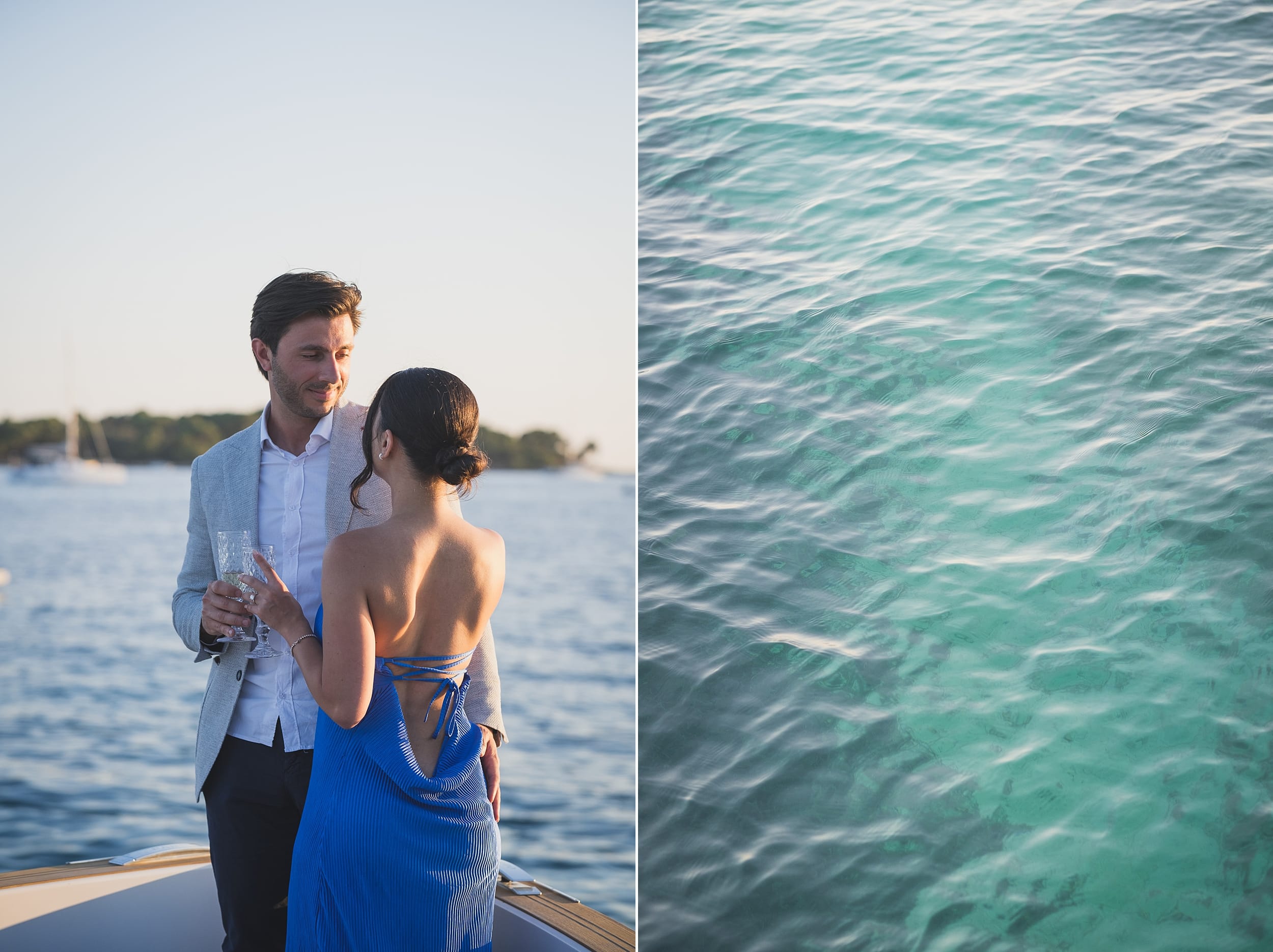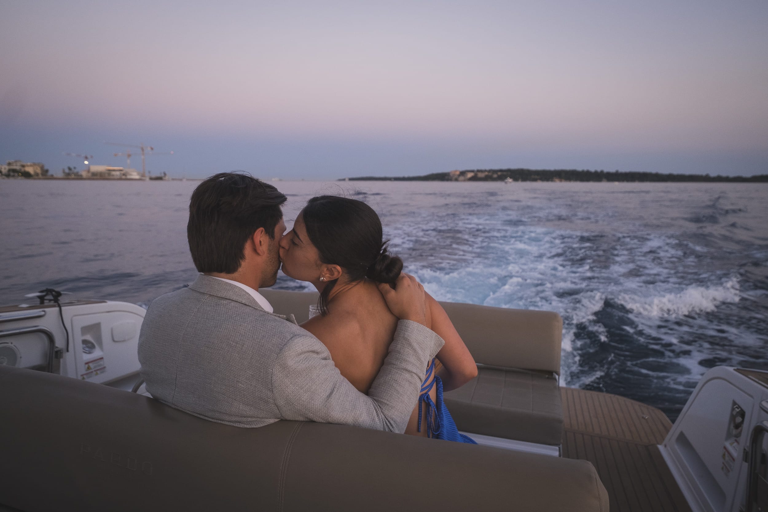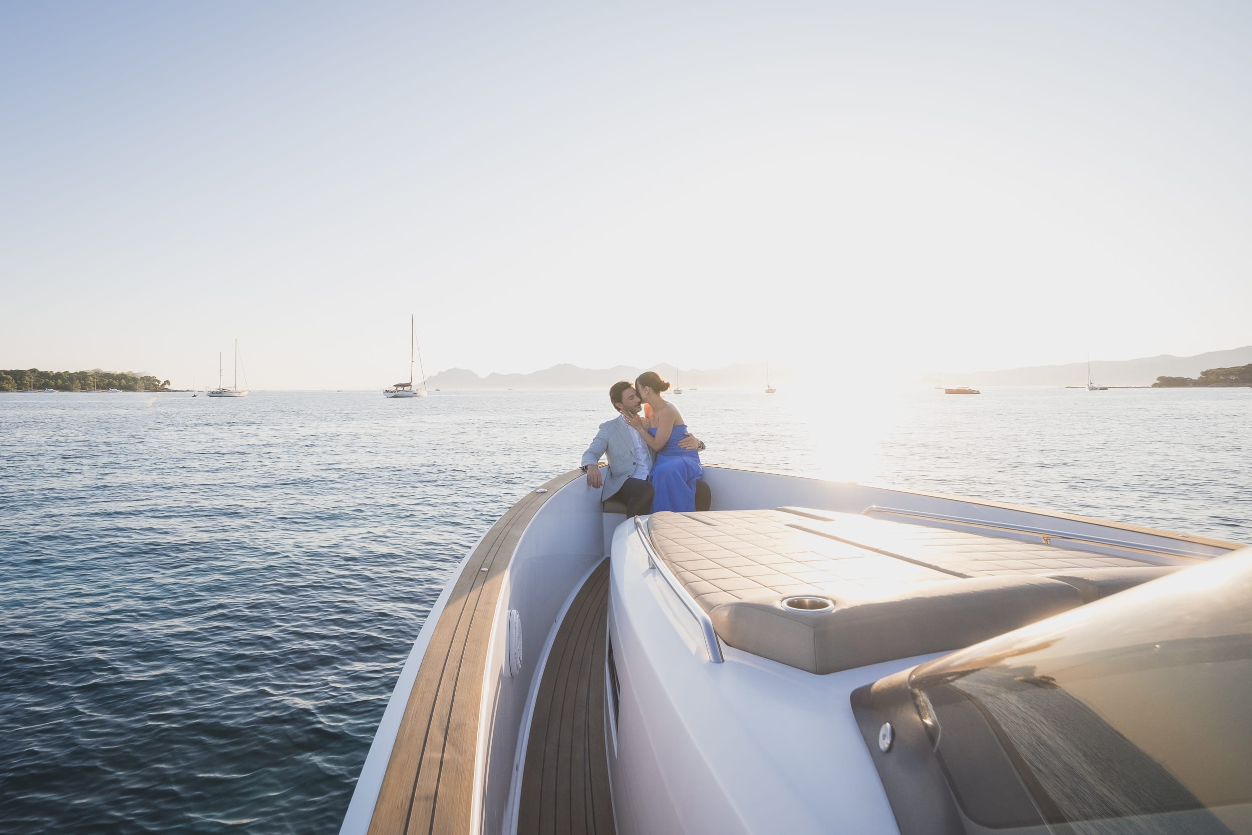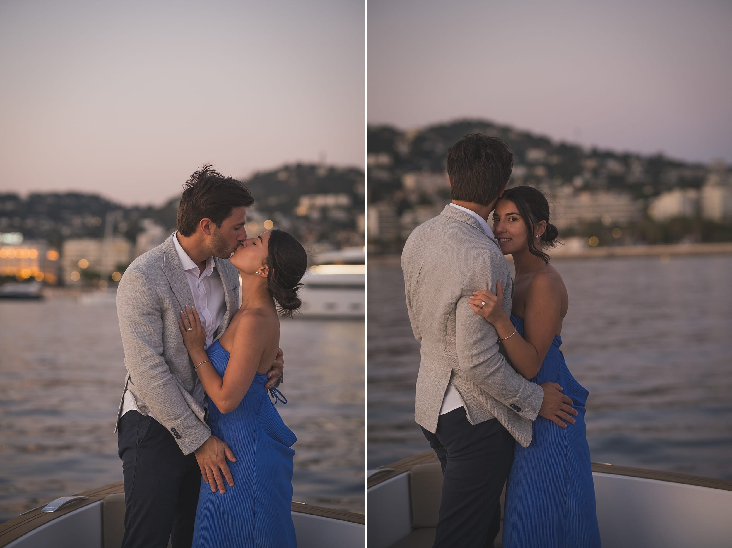 We captured a series of beautiful portraits as they embraced on deck — the sea behind them, the light fading into a gentle twilight. The mood was effortless, romantic, and authentic — the kind of moments that truly define the Riviera.