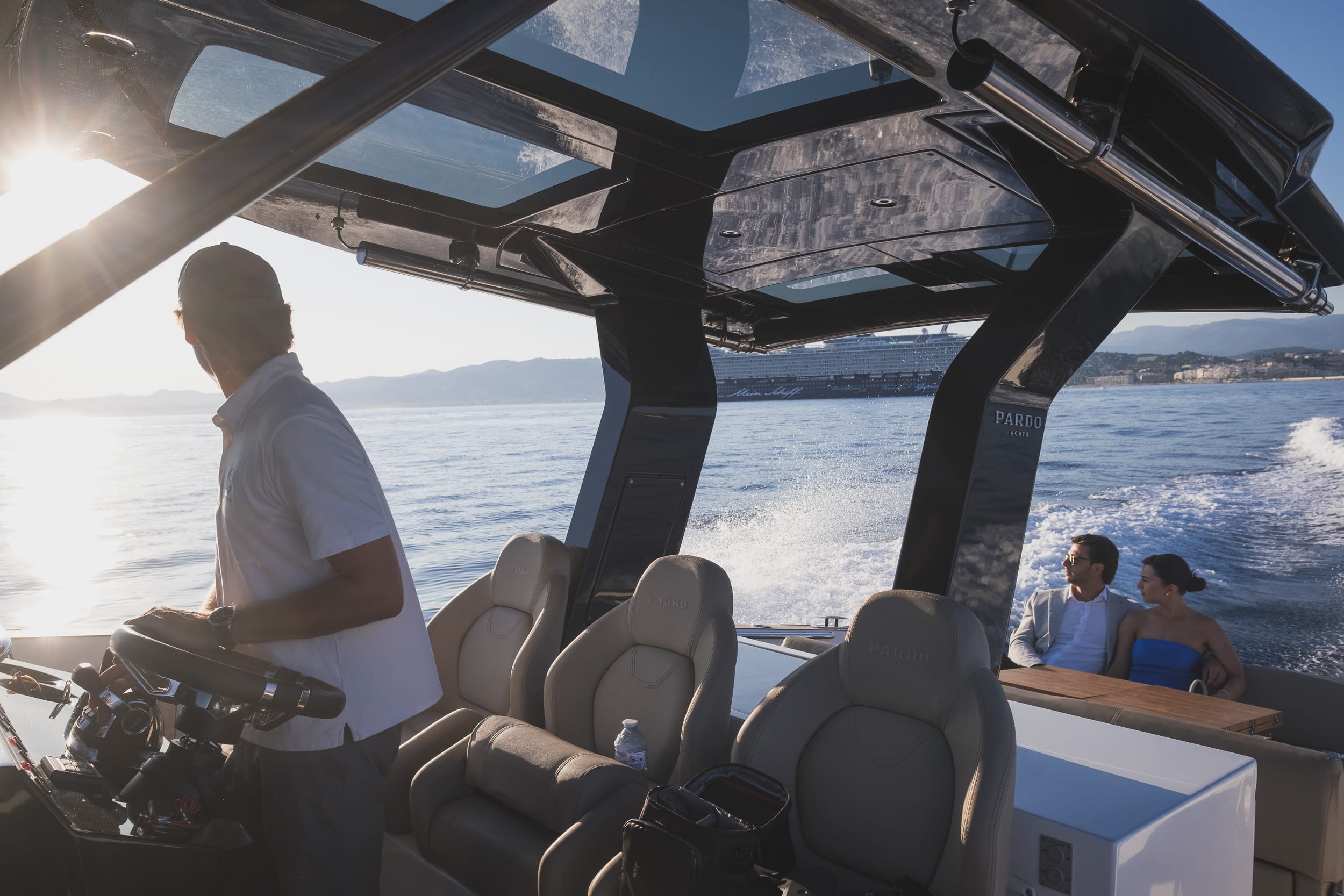 They had chosen a new Italian-designed Pardo yacht — sleek, luxurious, and incredibly elegant. With its open deck and low, seamless connection to the sea, it offered the perfect setting to enjoy the Riviera coastline up close. The modern lines of the yacht, its fine details in light teak and leather, and the soft hum of the engine all created a sense of refined tranquility.