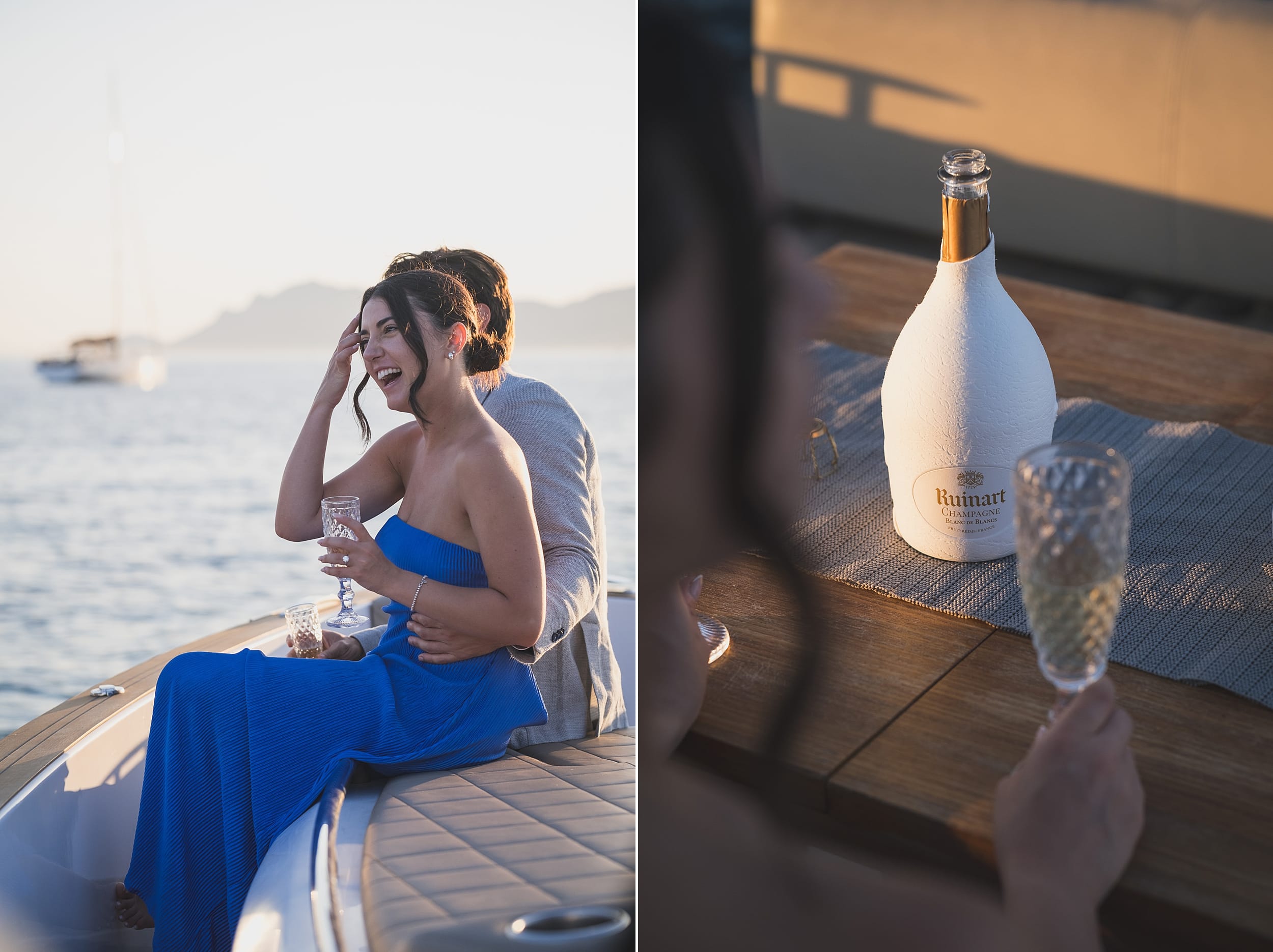 Moments later, laughter replaced tears. The cork of the Ruinart champagne popped, echoing softly over the water. They toasted to their new chapter, savoring both the taste and the meaning of that glass — a promise, a future, and a dream come true.