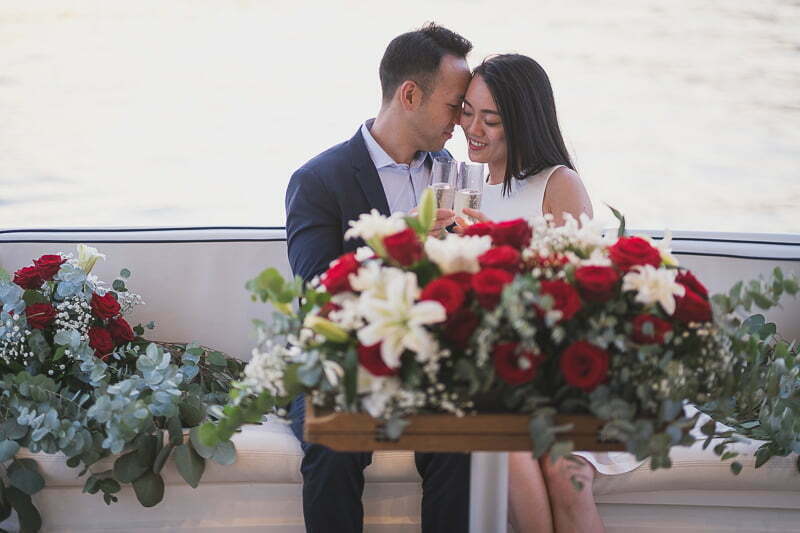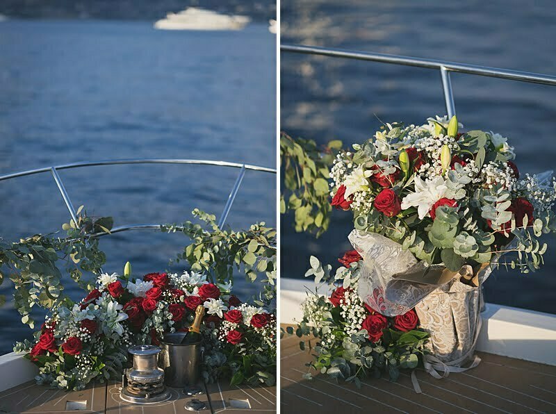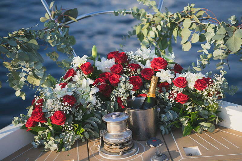 As Tina enjoyed her drink, we discreetly began to prepare the bow of the yacht. A bouquet of fresh flowers waited quietly, arranged in romantic tones to match the evening light. A chilled bottle of champagne rested nearby, ready to celebrate what was about to happen.