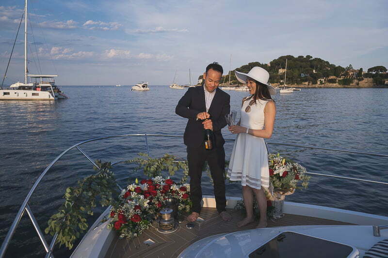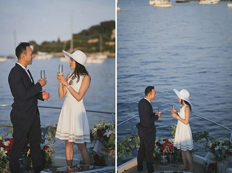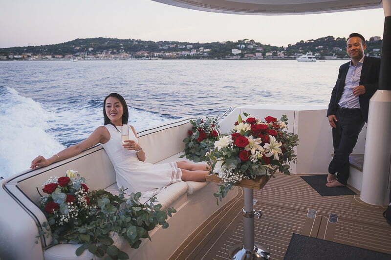 He knelt down on the deck, with the Mediterranean stretching endlessly behind him, the sun glowing on the horizon, and the sound of the sea as the only witness. The proposal was intimate, simple, and deeply moving — the kind of moment that doesn’t need words. Just two people, love, and the beauty of the French Riviera.