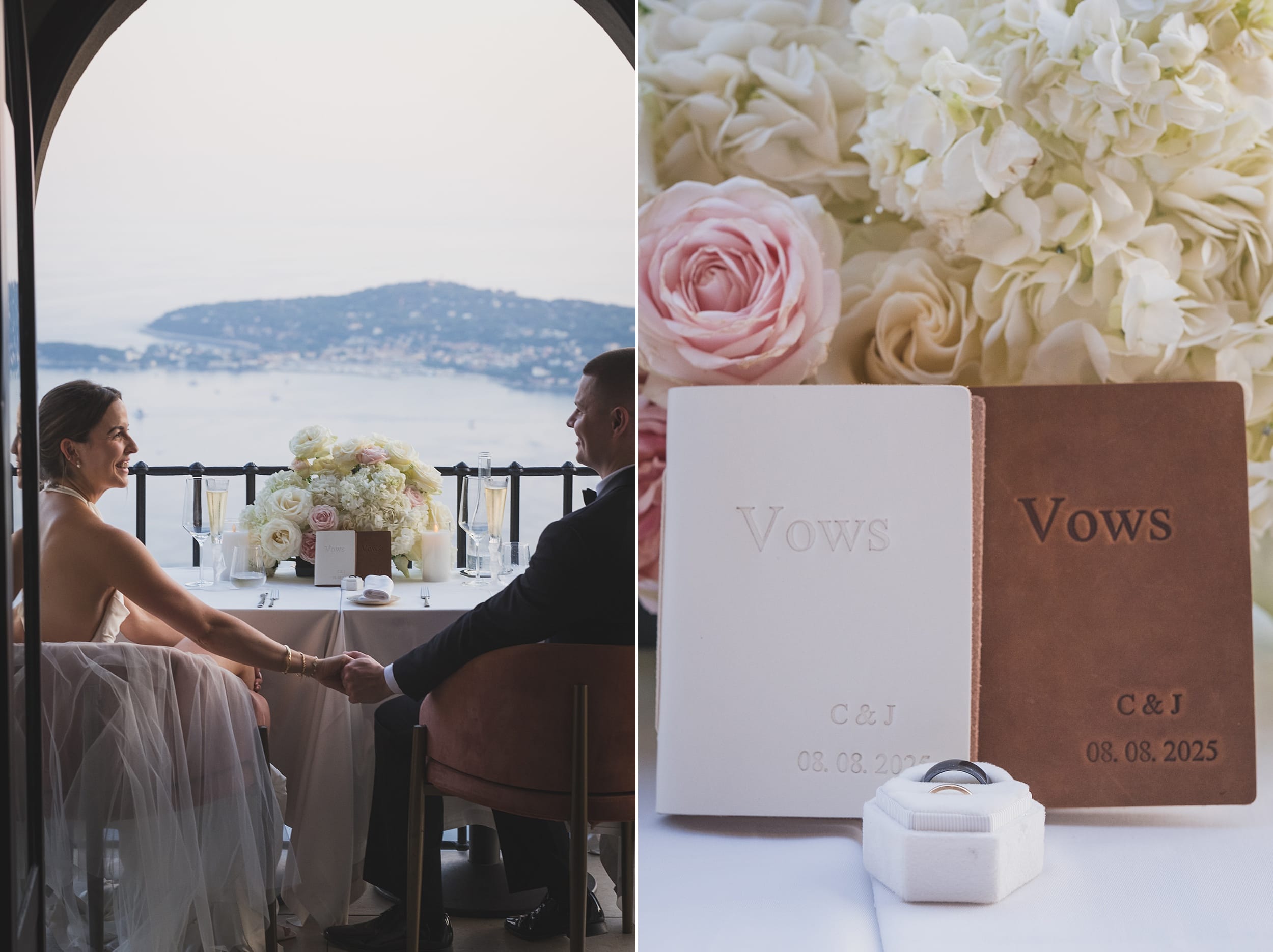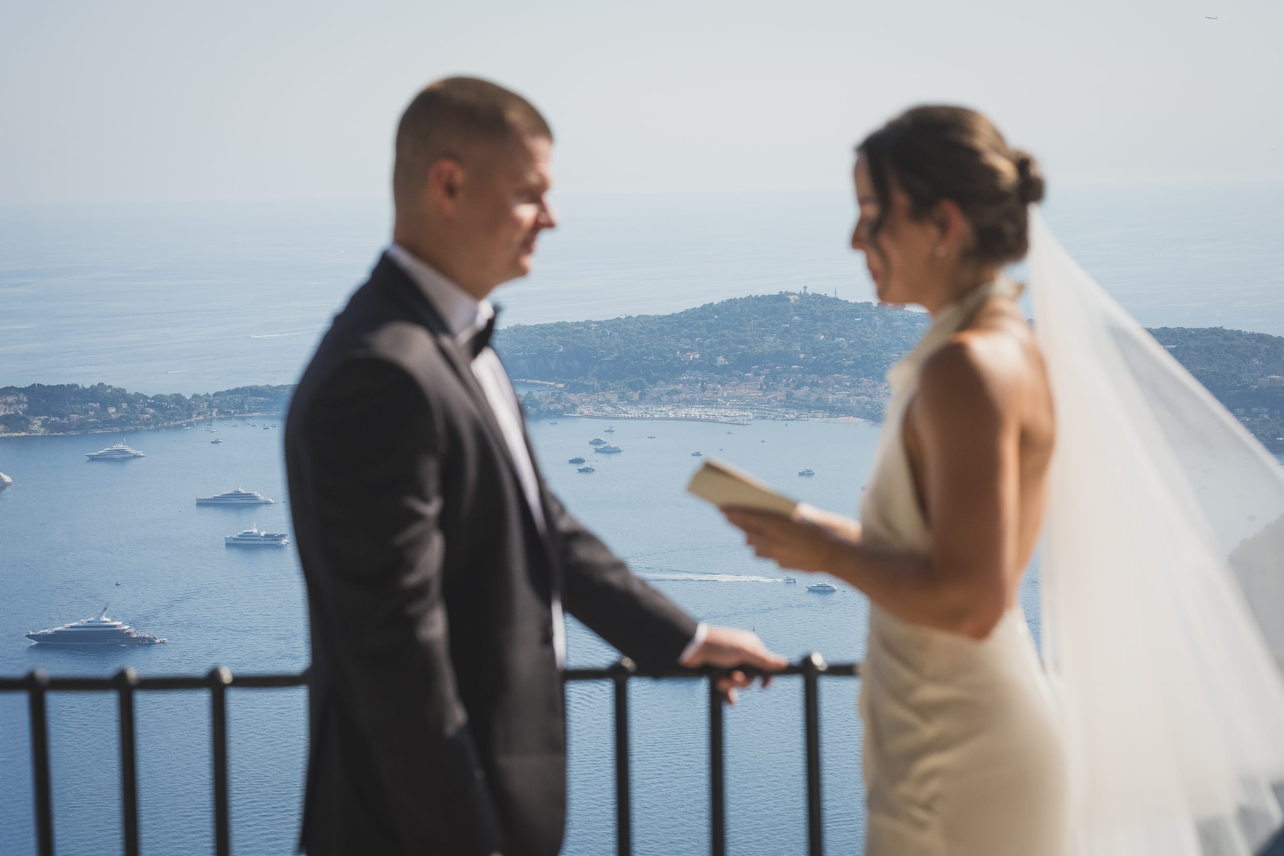 They chose Èze for its timeless charm — a hilltop village where stone walls meet the sky and every corner feels touched by romance. Nestled between Nice and Monaco, Èze feels suspended in time, its cobblestone alleys leading to breathtaking views of the Mediterranean. Their French Riviera elopement began in the afternoon, on one of the private balconies of Château Eza, bathed in soft golden light. With the sea stretching endlessly below, they exchanged heartfelt vows — quiet words filled with emotion, joy, and a sense of forever. The view, the gentle sea breeze, and the intimacy of the moment made it feel as if the world had stopped for them.