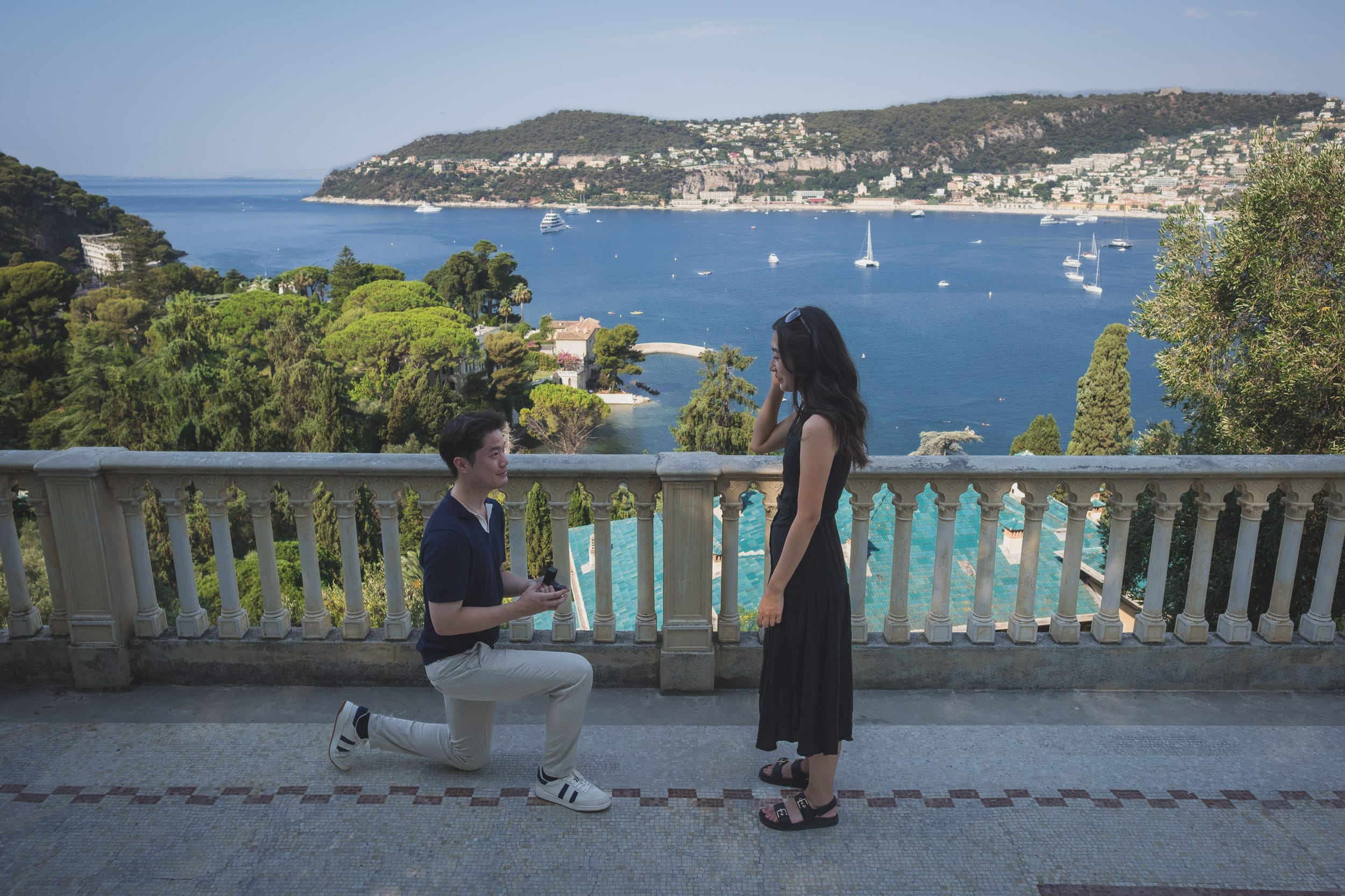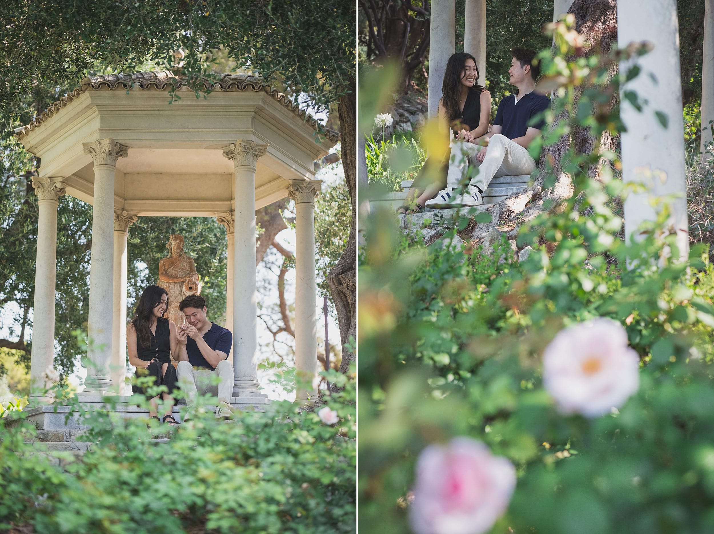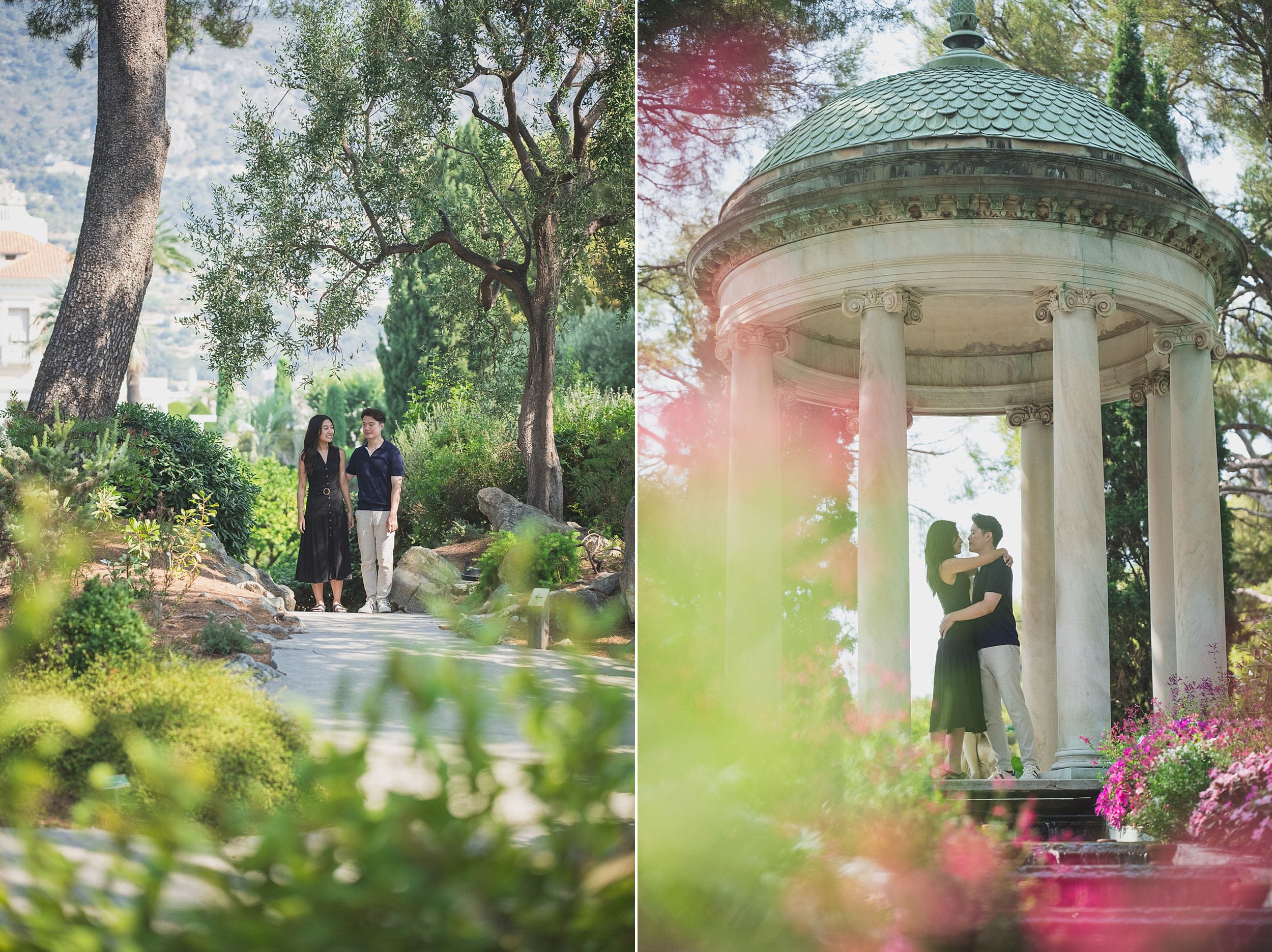 The morning light gradually shifted, turning warmer and casting gentle shadows that enhanced the villa’s pink façade and highlighted the textures of the surrounding flora. Small groups of visitors began to arrive, but by then, the proposal story had already unfolded fully. We lingered for a while in the Florentine-inspired corners of the gardens, where cypress trees and sculpted hedges frame the couple like classical paintings. Each turn offered a new perspective: a sun-dappled walkway, a hidden alcove, a perfect frame with the Bay of Villefranche in the distance.