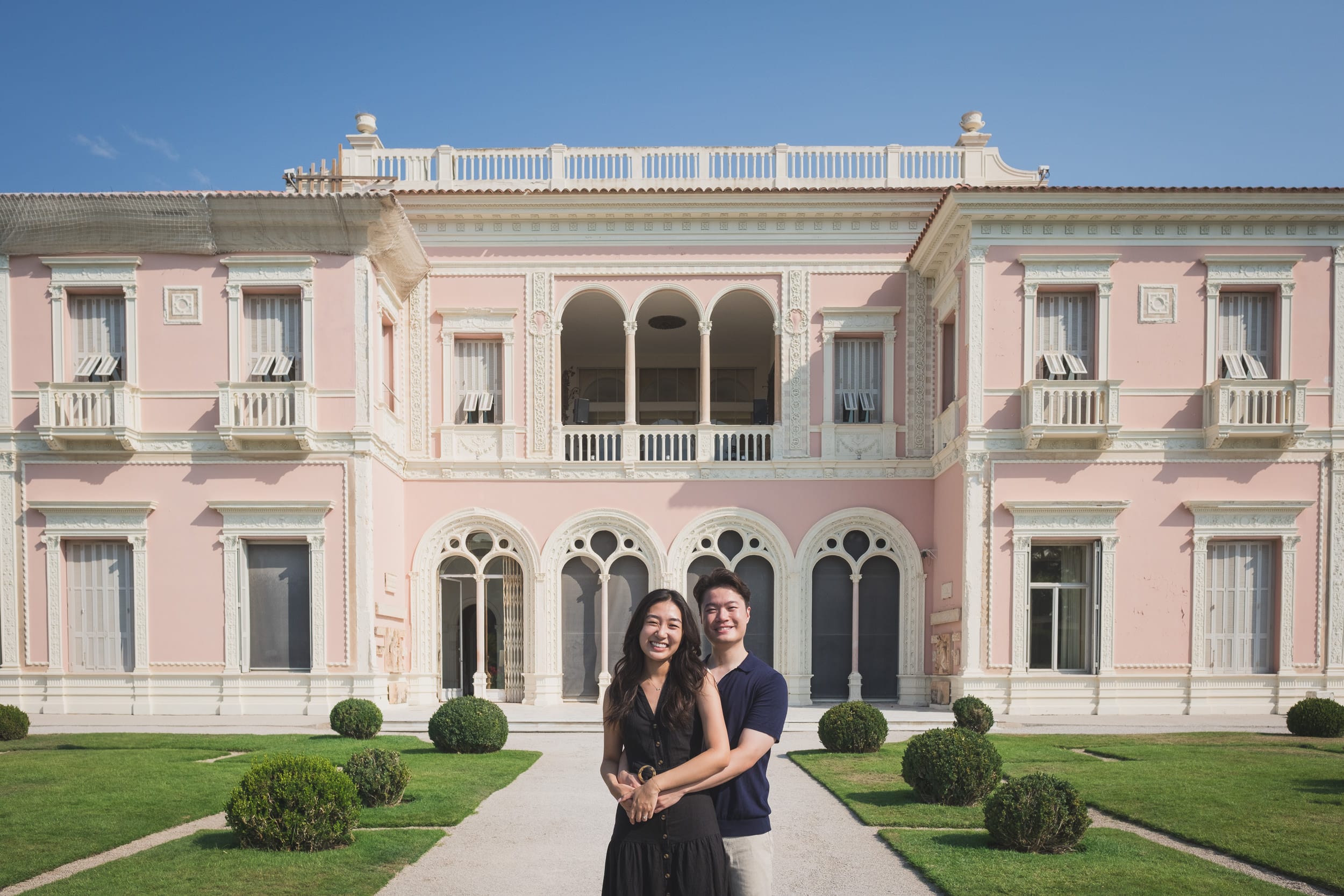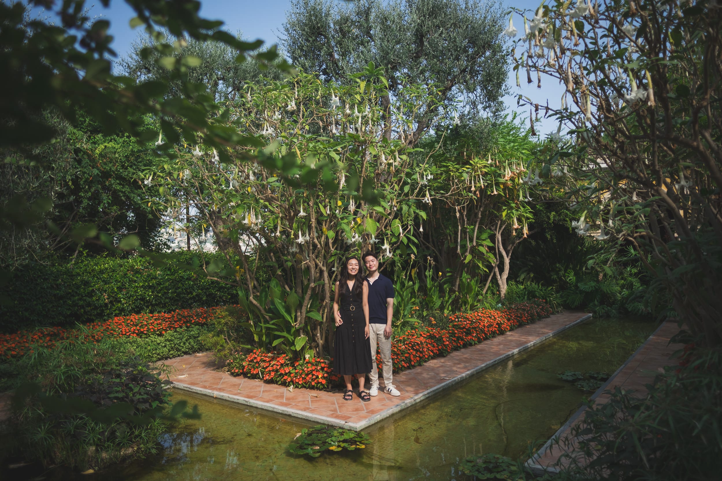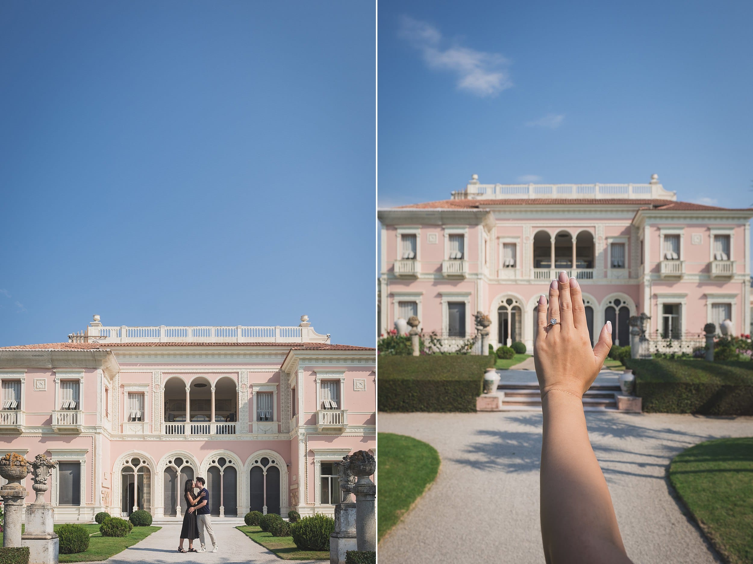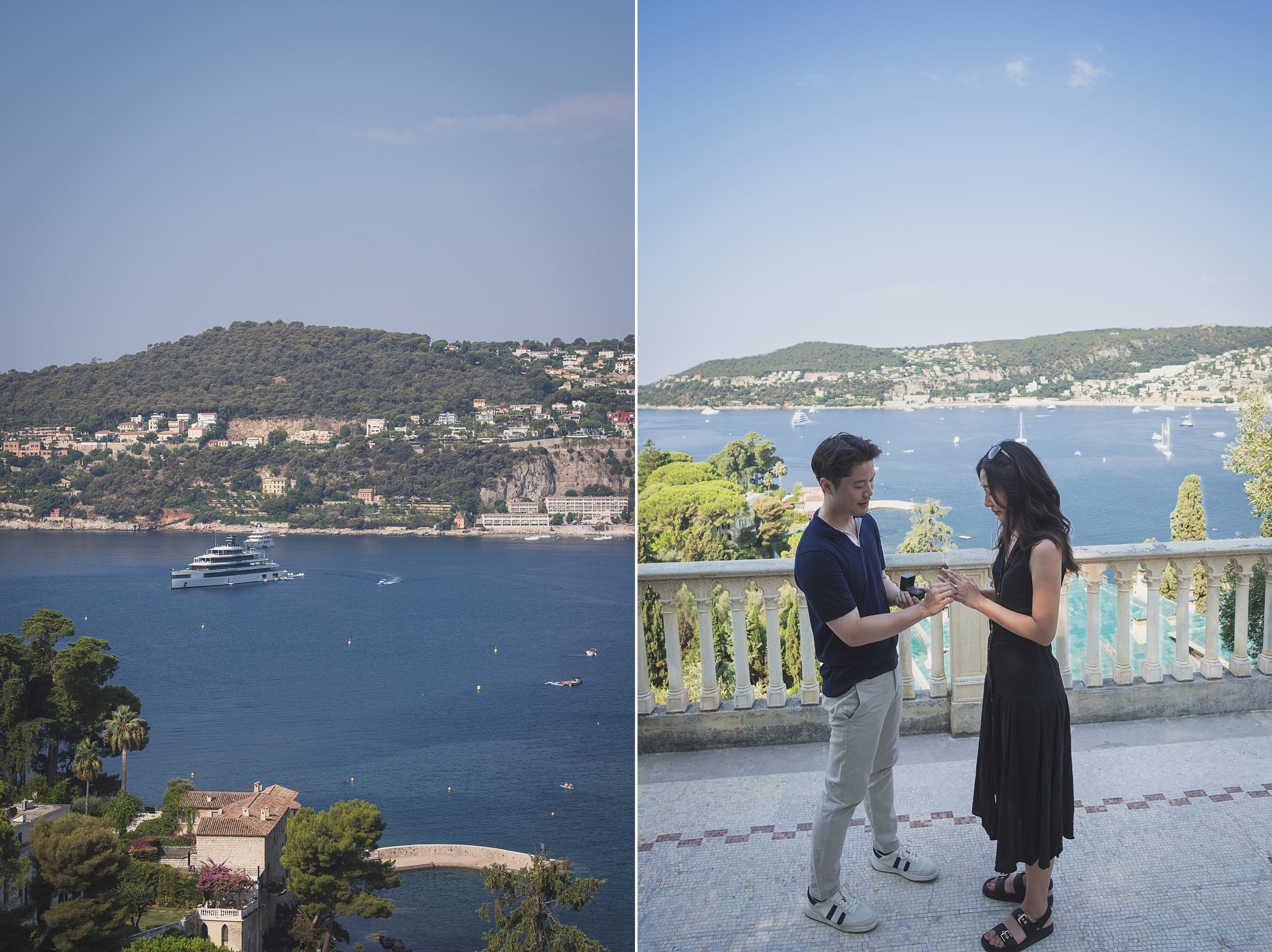 The morning light gradually shifted, turning warmer and casting gentle shadows that enhanced the villa’s pink façade and highlighted the textures of the surrounding flora. Small groups of visitors began to arrive, but by then, the proposal story had already unfolded fully. We lingered for a while in the Florentine-inspired corners of the gardens, where cypress trees and sculpted hedges frame the couple like classical paintings. Each turn offered a new perspective: a sun-dappled walkway, a hidden alcove, a perfect frame with the Bay of Villefranche in the distance.