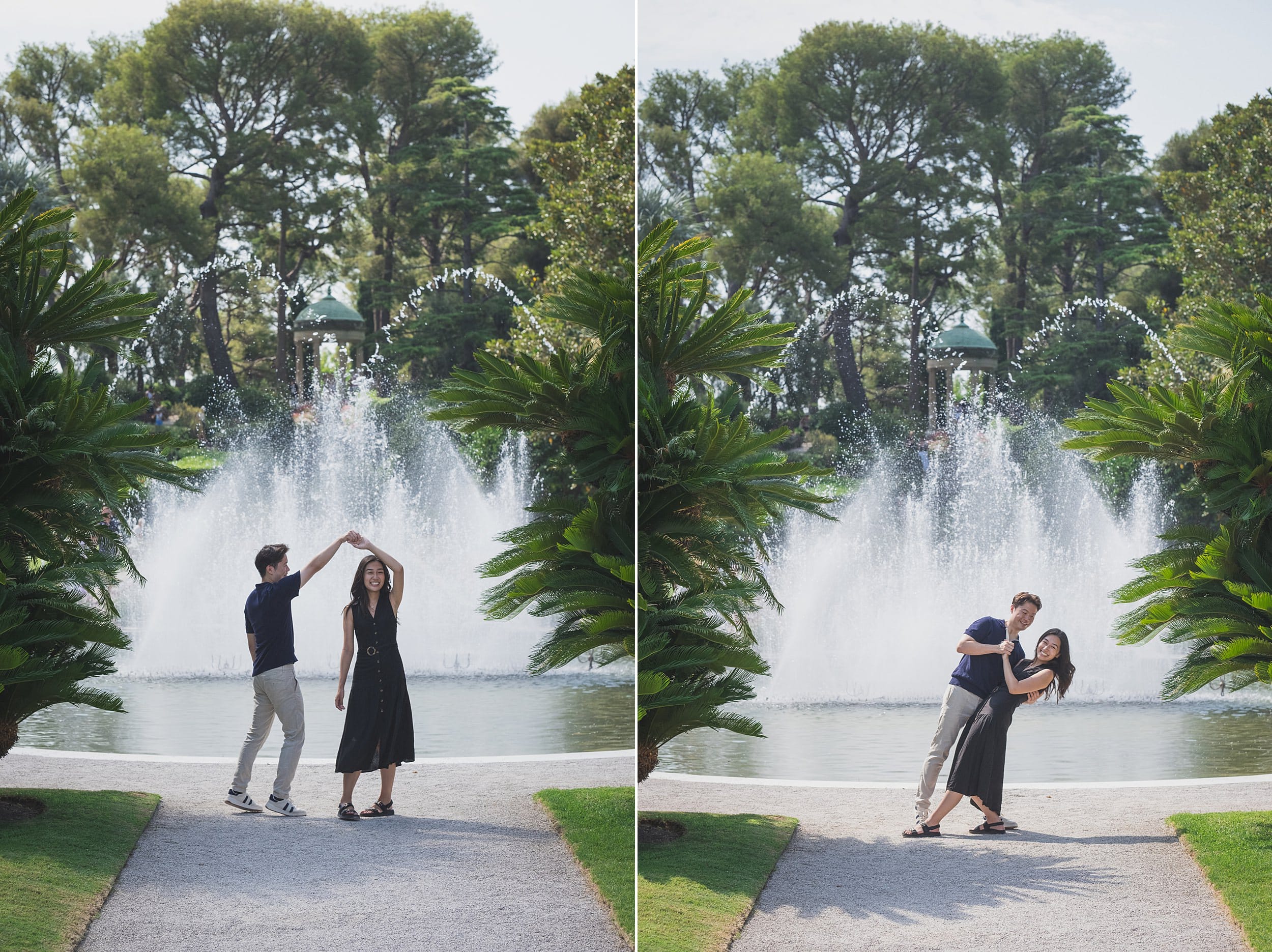 After the heartfelt “yes,” the morning continued in an almost dreamlike serenity. We wandered through Villa Ephrussi’s themed gardens, a sequence of carefully designed spaces each with its own character. Passing by the fountain with water jets dancing in the gentle breeze, the couple felt as if the world had paused for them. The fountain’s playful arcs of water mirrored their laughter and the lightness of the moment, while soft sunlight shimmered across the cobblestones, adding texture and depth to each photograph. These were moments of pure presence, where the environment became part of their love story.