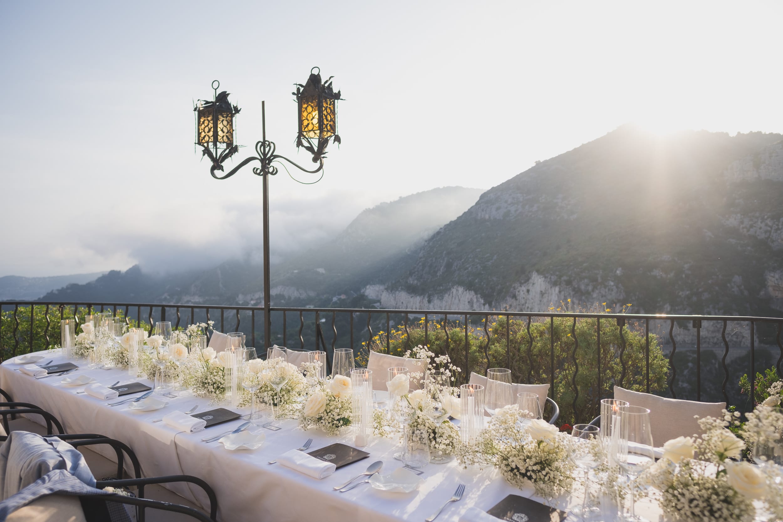 The restaurant room at Château Eza doesn’t offer the same open-air, under-the-stars atmosphere as the terrace. However, it provides a cozy and elegant indoor setting that can comfortably accommodate 40 seated guests—ideal for slightly larger celebrations. While it’s enclosed, the room still boasts breathtaking views of the sea and cliffs through its wide windows. It’s a beautiful option when you want a bit more space without giving up the magic of the location.