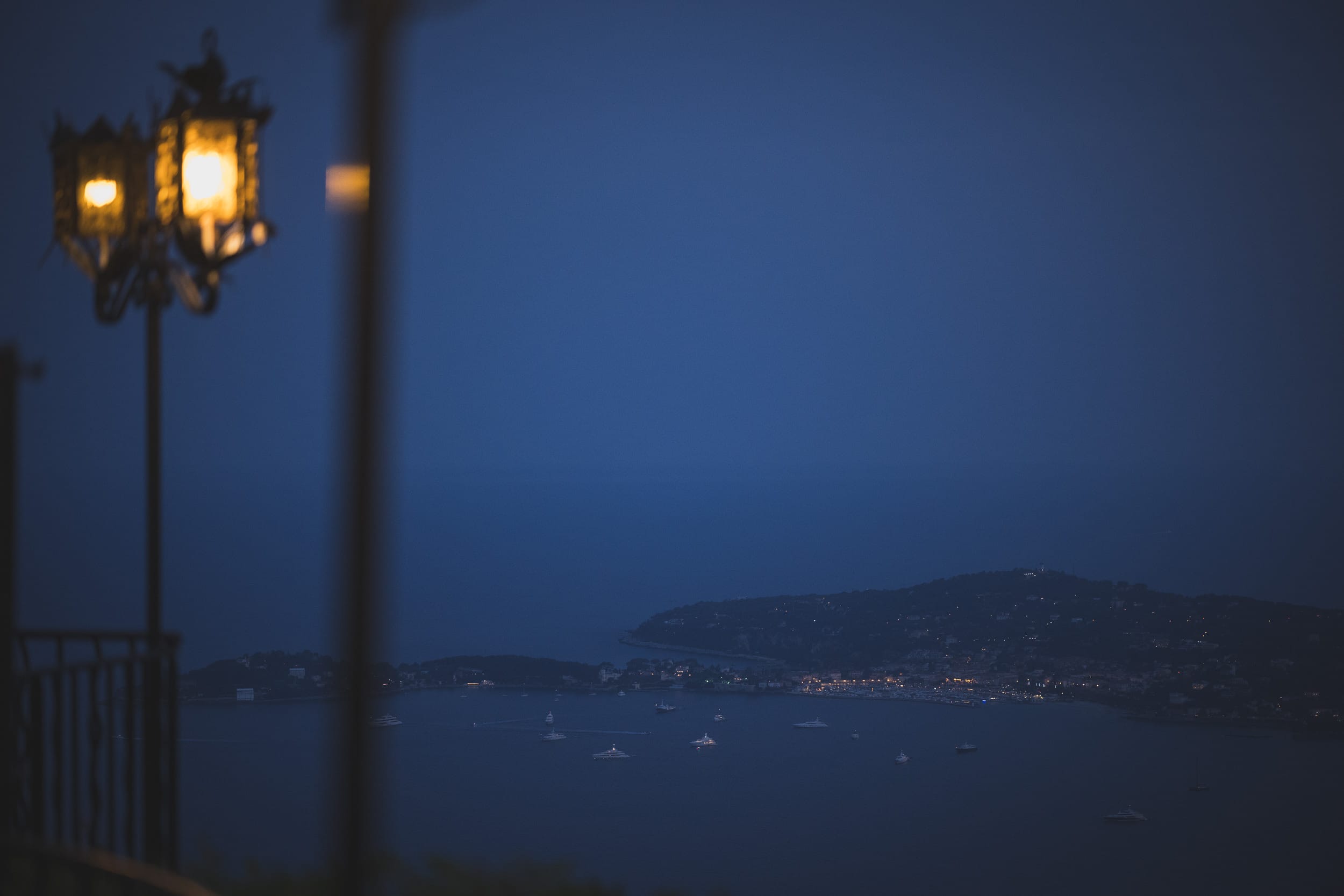 As the sun sets over Chateau Eza, a magical transformation begins, enveloping the atmosphere in romance. The city lights reflect softly on the water and surrounding mountains, creating a cocoon-like ambiance that feels enchanting and intimate. With each passing moment, the evening unfolds into a dreamlike setting where love and beauty converge under the starlit sky.