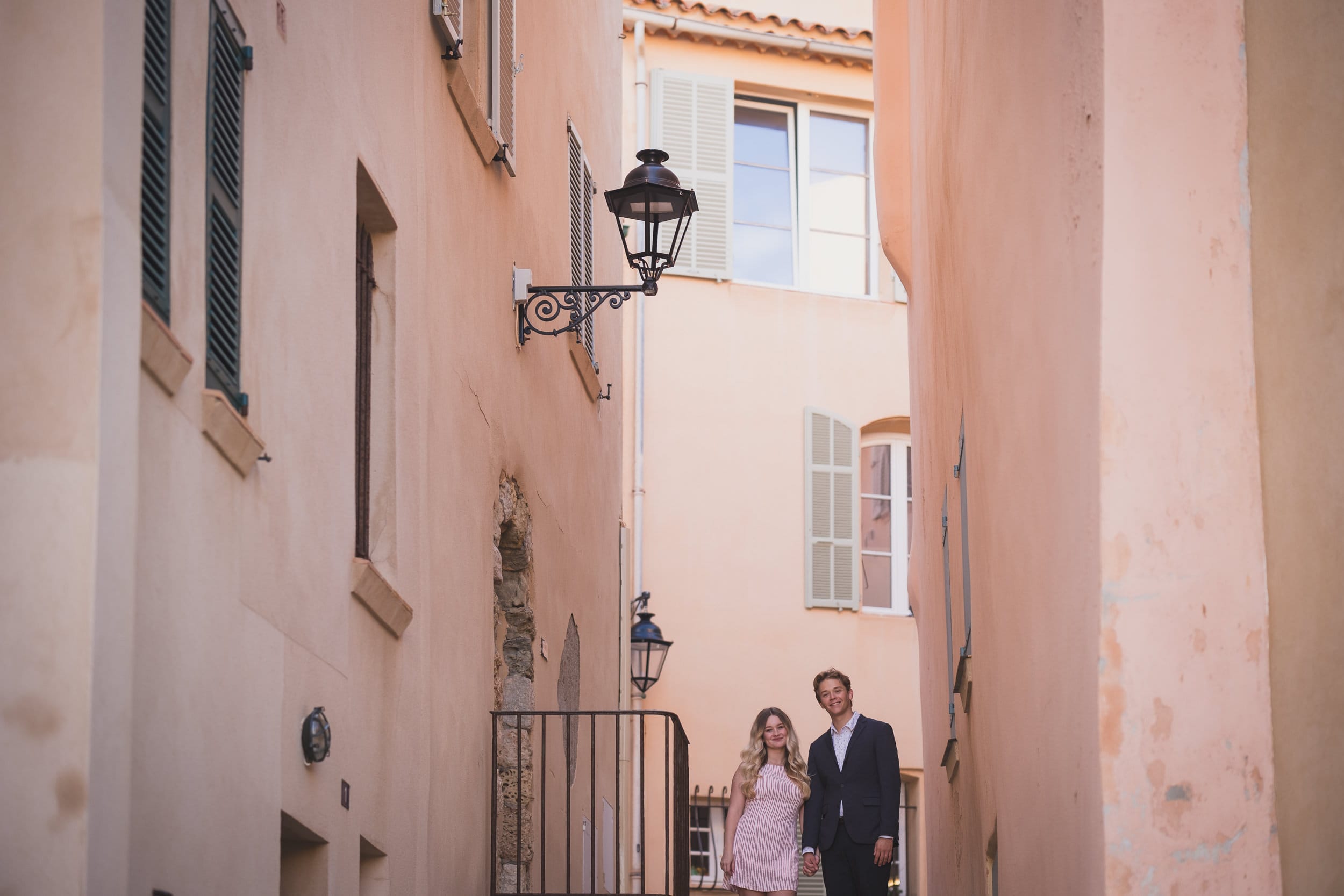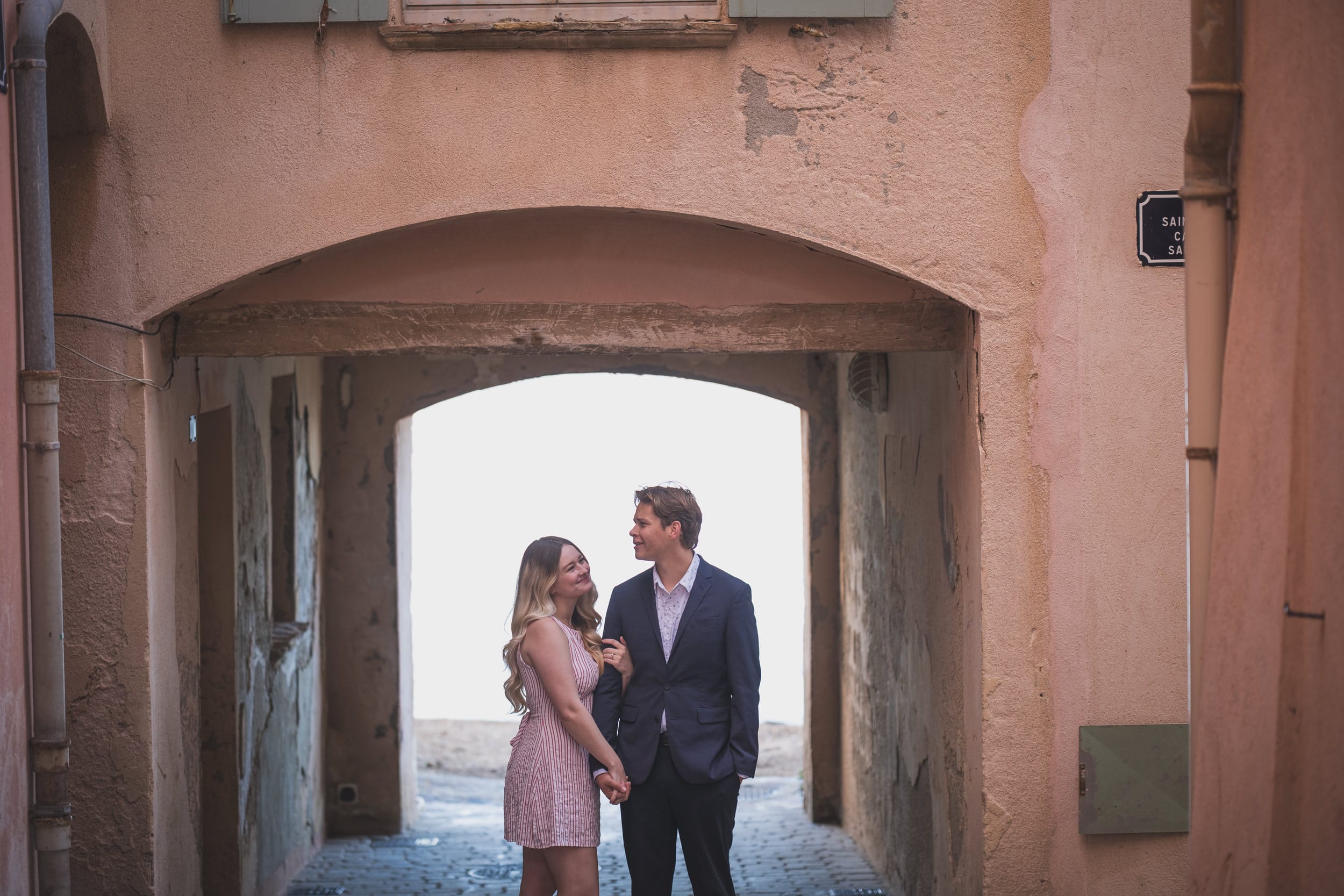 Following the emotional high of the proposal, the couple wanted a calm moment to let the reality sink in. We took a quiet stroll through the awaking town, wandering through the narrow, historic streets and passing the iconic red-and-yellow bell tower of the Église Notre-Dame-de-l’Assomption.
