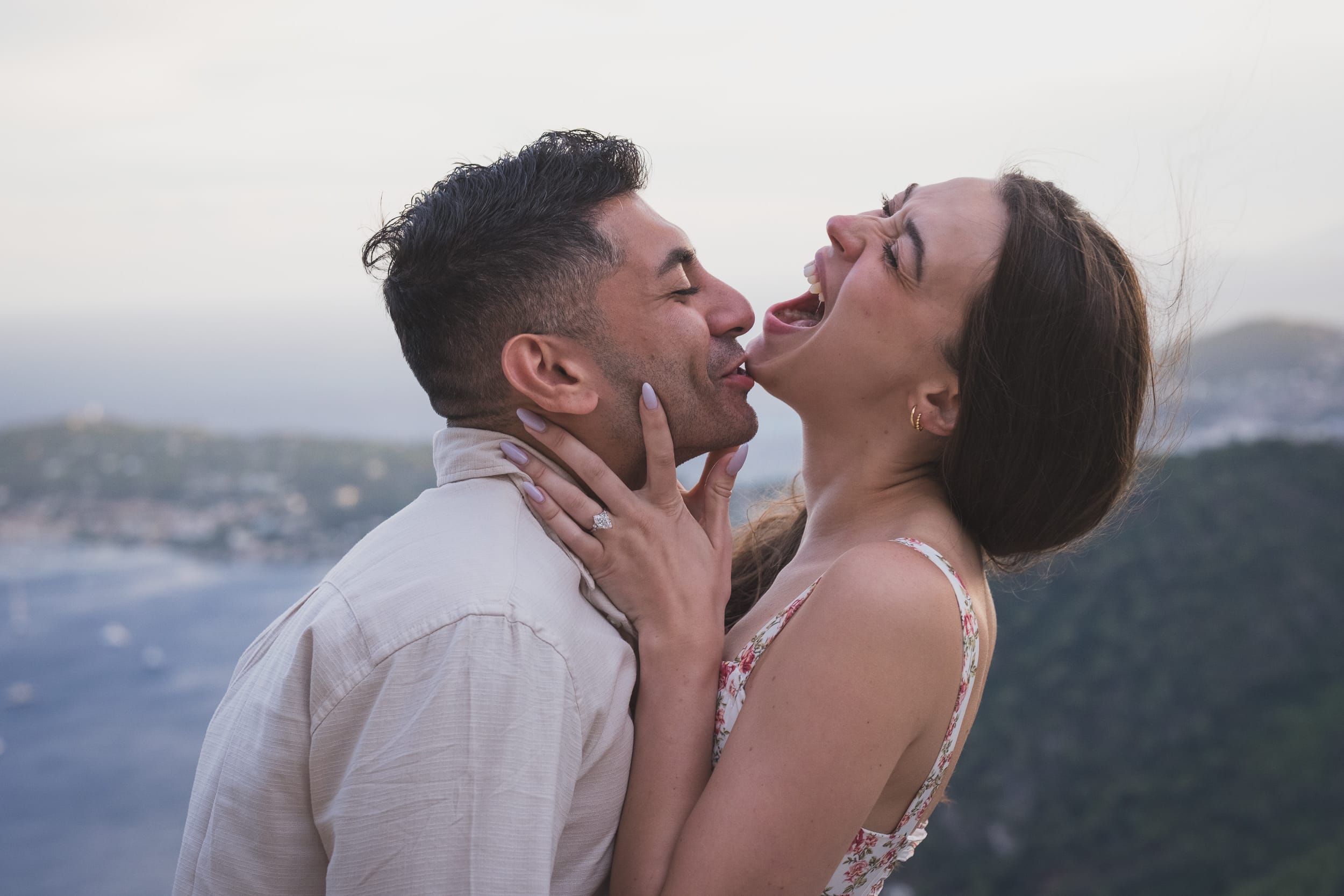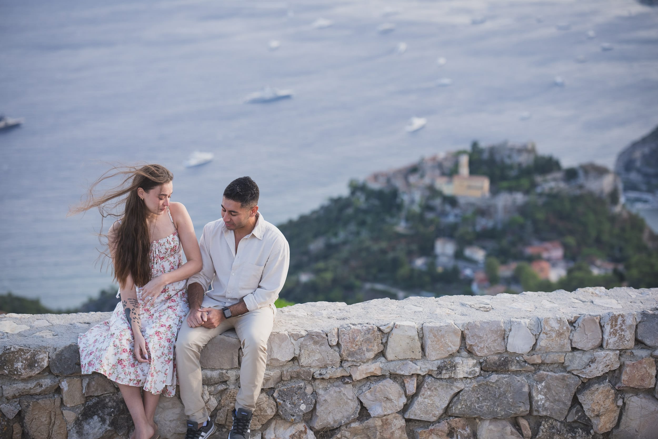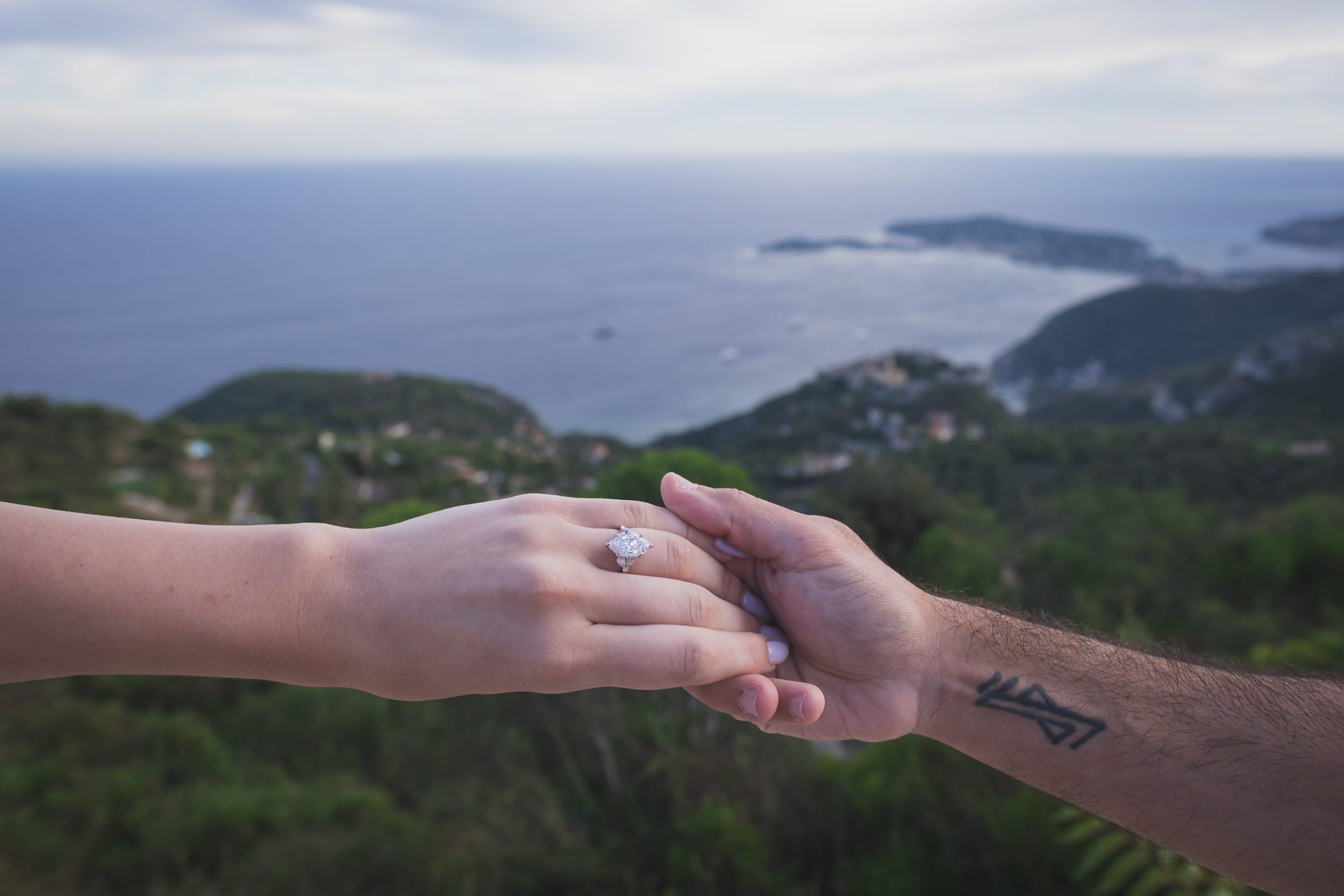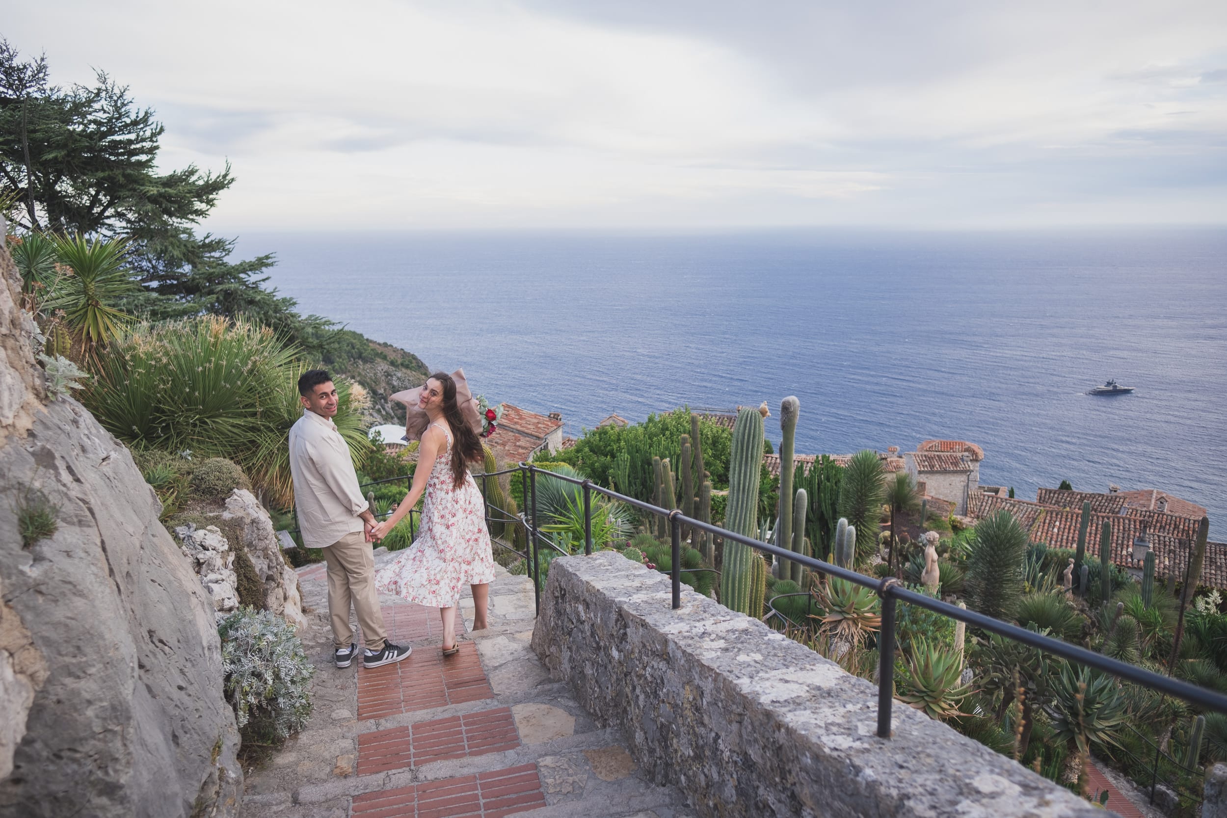 As they strolled through the park, the wind whipped through the tall grass and the sea crashed far below, creating a feeling that they were the only two people on earth. When he dropped to one knee, overlooking the dramatic coastline and the distant village of Eze, the moment was raw and real.